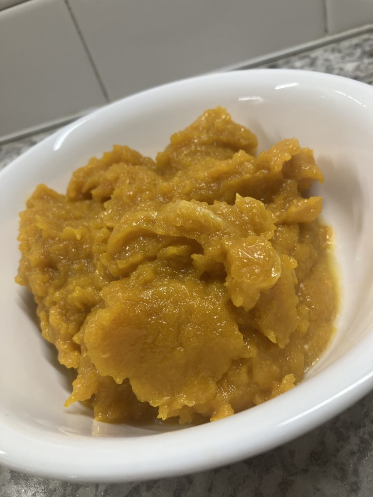 Once the squash has cooled and can be comfortably handled, scoop out the meat of the squash and place it into a bowl. Depending on how large your squash is you will need to slightly adjust your butter and sugar. The amount of sugar will also depend on your family’s preferences and how sweet you would like the squash to taste.