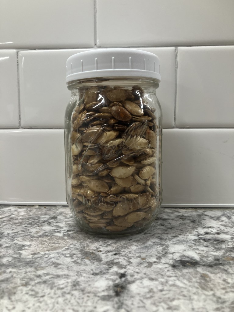 Place into a 400°F oven and bake the seeds for approximately 30 minutes. The seeds will start to turn a slight golden or brown color. Remove the seeds from the oven and allow them to cool on the baking sheet completely. After the seeds have cooled, use the parchment paper to dump the seeds into an airtight storage container such as a Mason jar with a lid.