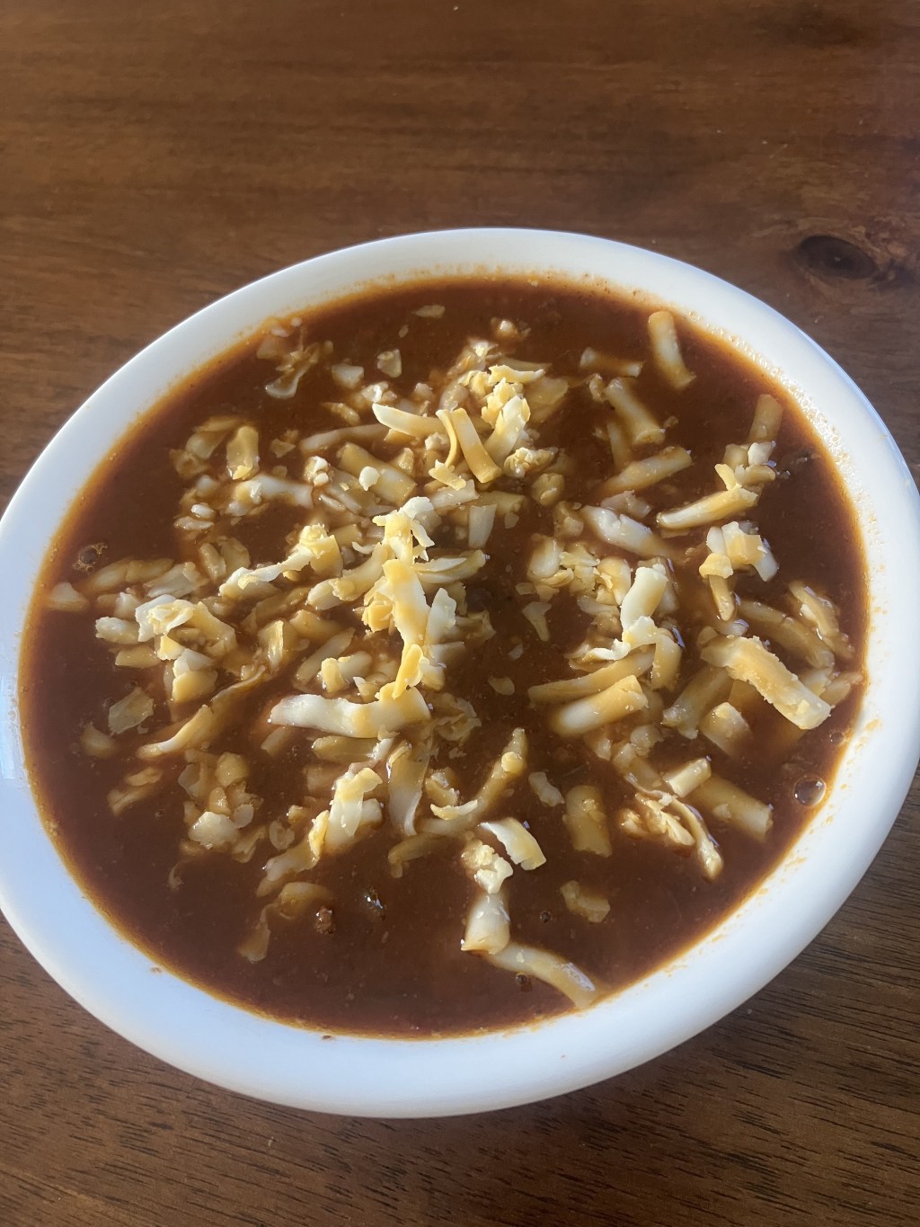 When you are ready to serve the chili, serve it hot. My family likes to top it with more fresh onion, shredded cheese, Fritos, or saltine crackers.