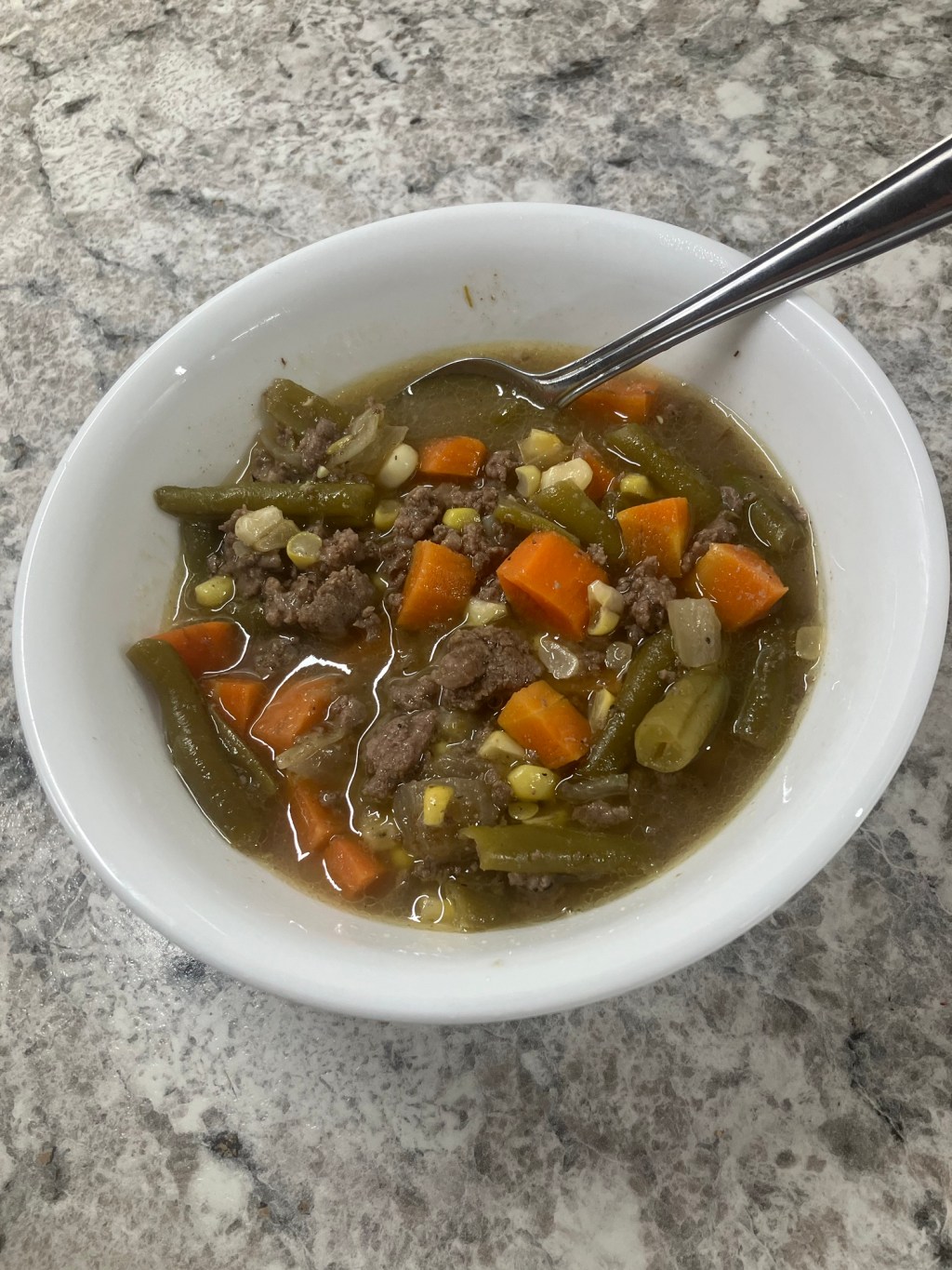Add carrots, corn, green beans, peas, and broth to the stock pot or crockpot before bringing it to a simmer. Allow the stew to simmer until all the vegetables are cooked through.