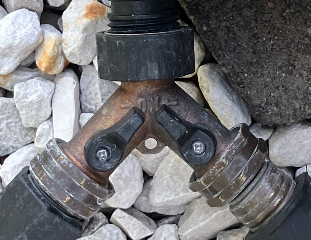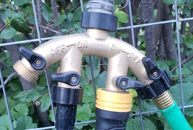 To keep water flowing to all the various hoses, four-ways and y’s are a necessity. I use these two water control systems both at the water source and in various strategic places throughout my garden to allow water to be adjusted for each plant variety and garden bed as needed.