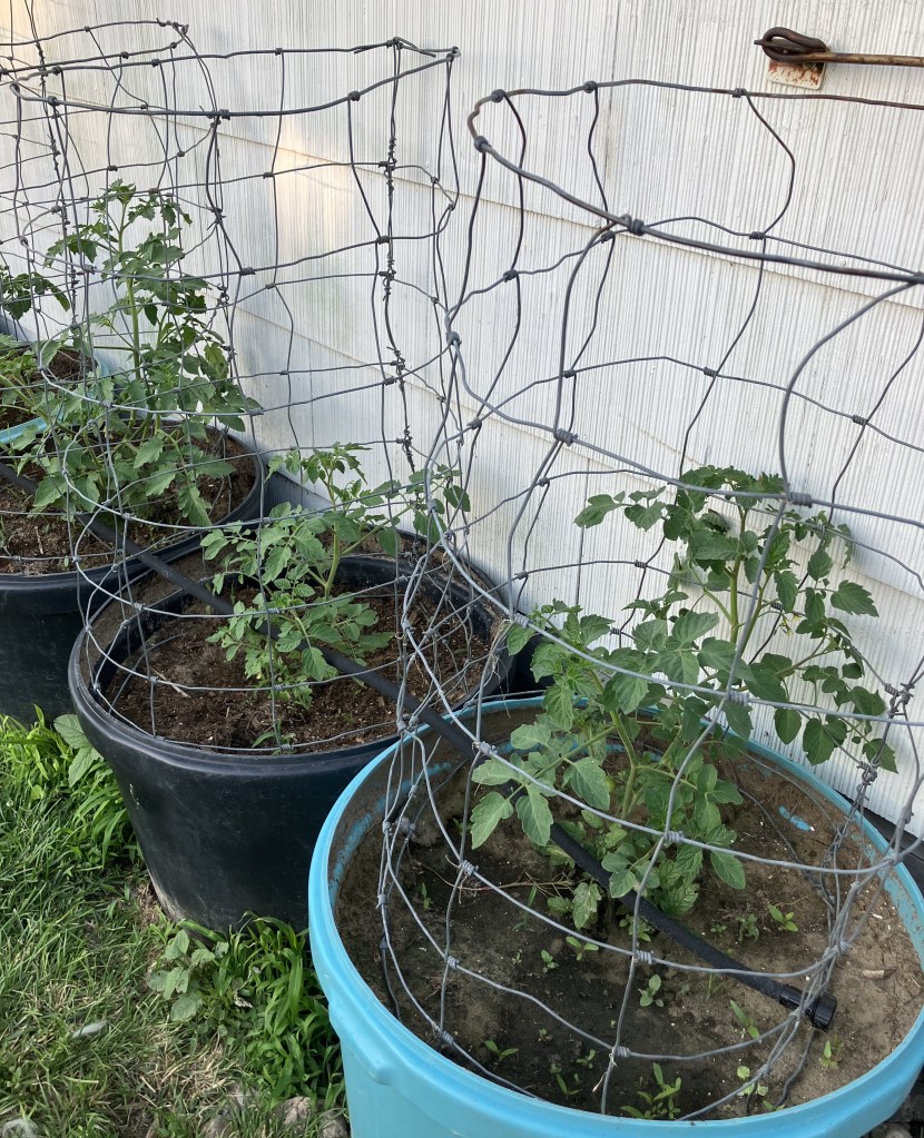 Cages can help to protect your plants, but they also provide some stability for plants like tomatoes as they grow and bush out. They help to give structure without restricting the plant from growing.