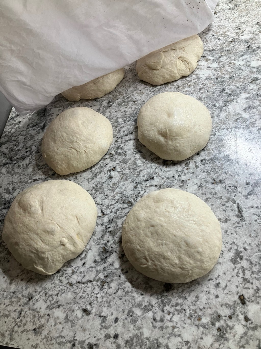 On a well floured surface, shape each portion of dough into a ball before placing them to rest under a damp cloth like a tea towel for 30 minutes.