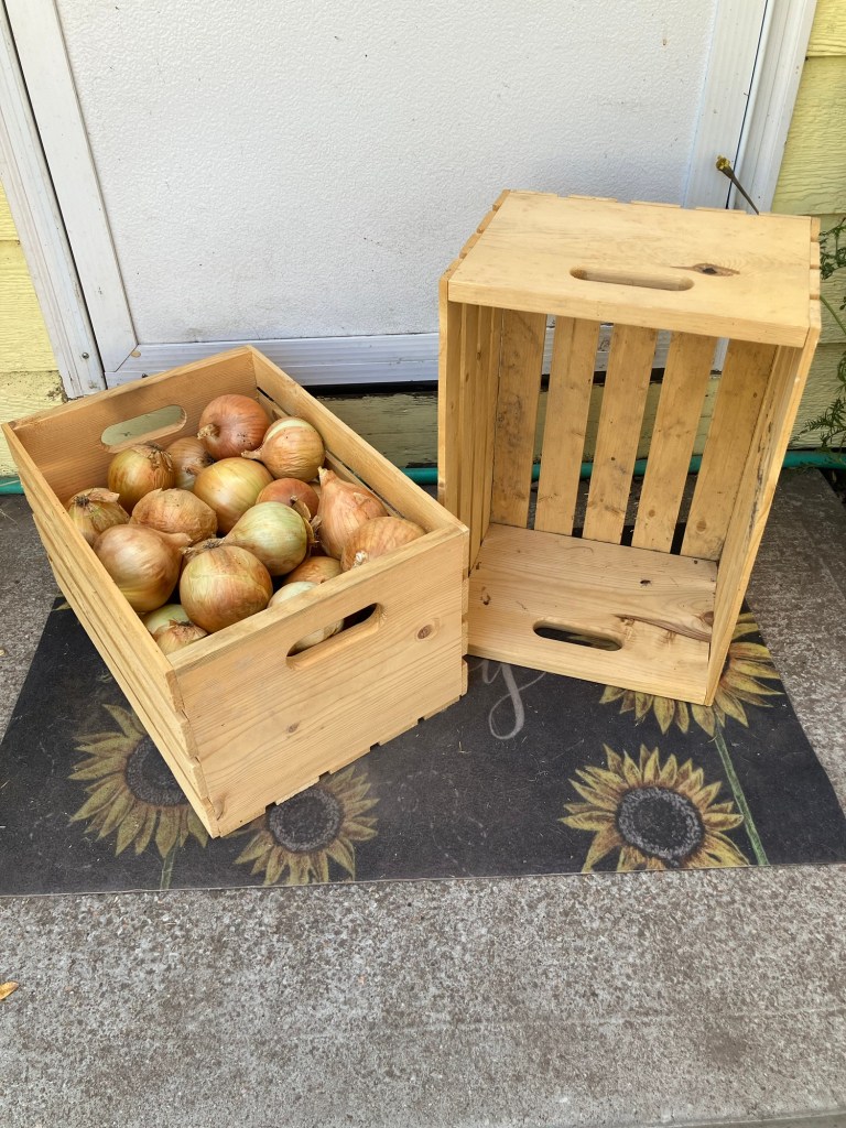 Crates are another favorite harvest container because they work so well for stacking lots of onions, carrots, or winter squash to transport or to store.