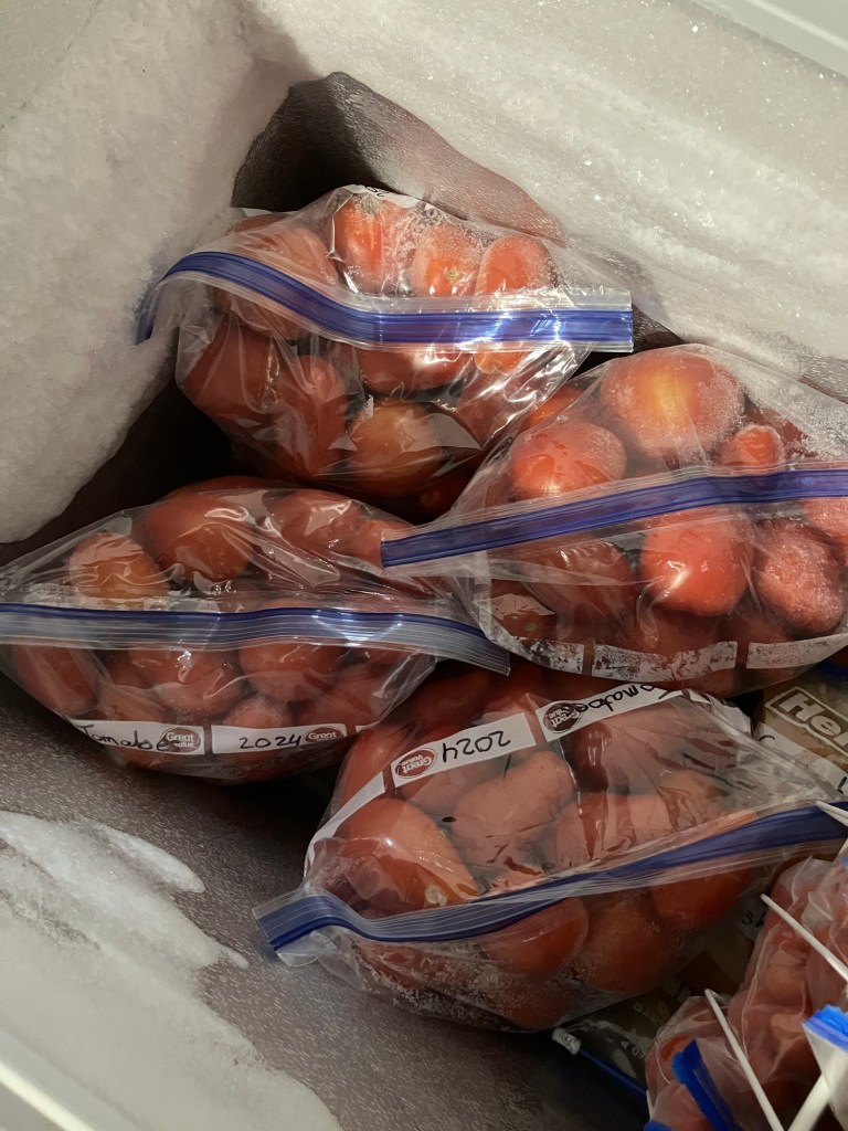 Freezing tomatoes makes them release most of their water, so it makes it faster to make things like pasta sauce since you don’t have to simmer it as long to cook off the excess liquid.