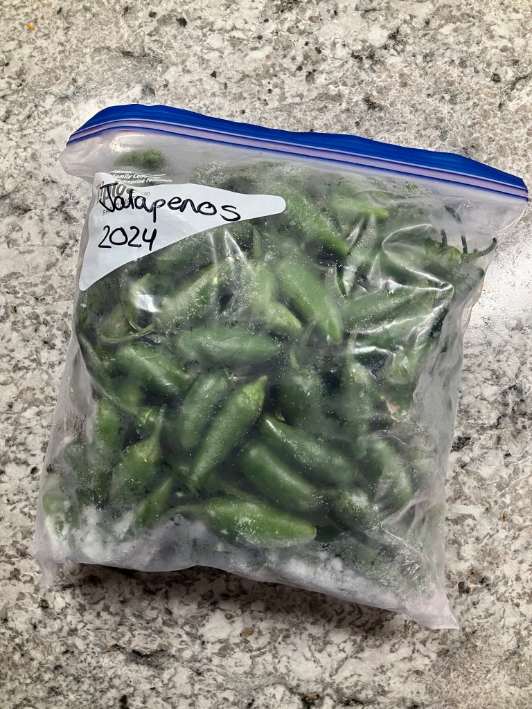Freezer bags can also be great for storing peppers if you don’t have the time to process them. I often wash and store jalapeños whole or green peppers diced and in small 1/2 cup to 1 cup increments to add to things like salsa and pasta sauce later.