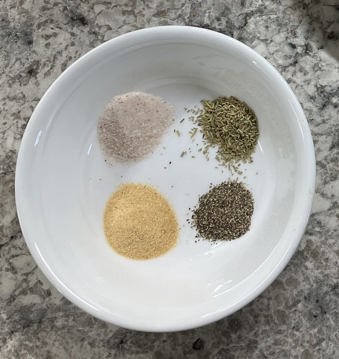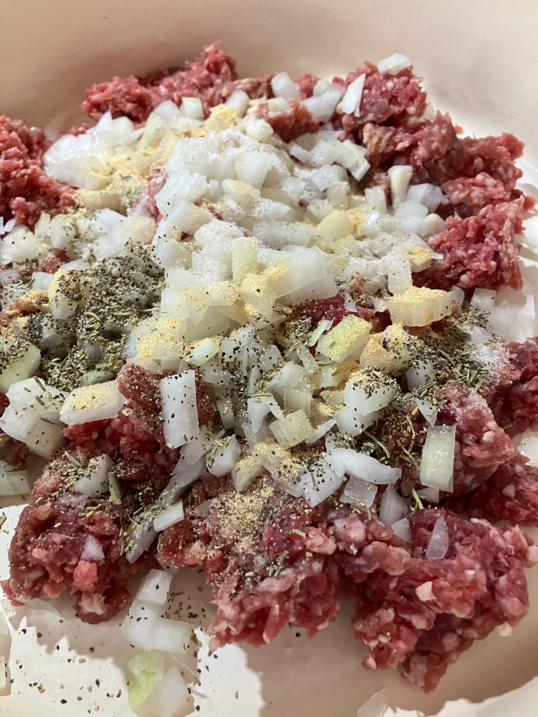 First, I’ll brown the ground beef with salt, pepper, garlic powder, rosemary, and diced onion.