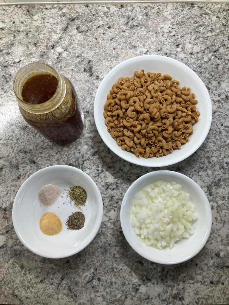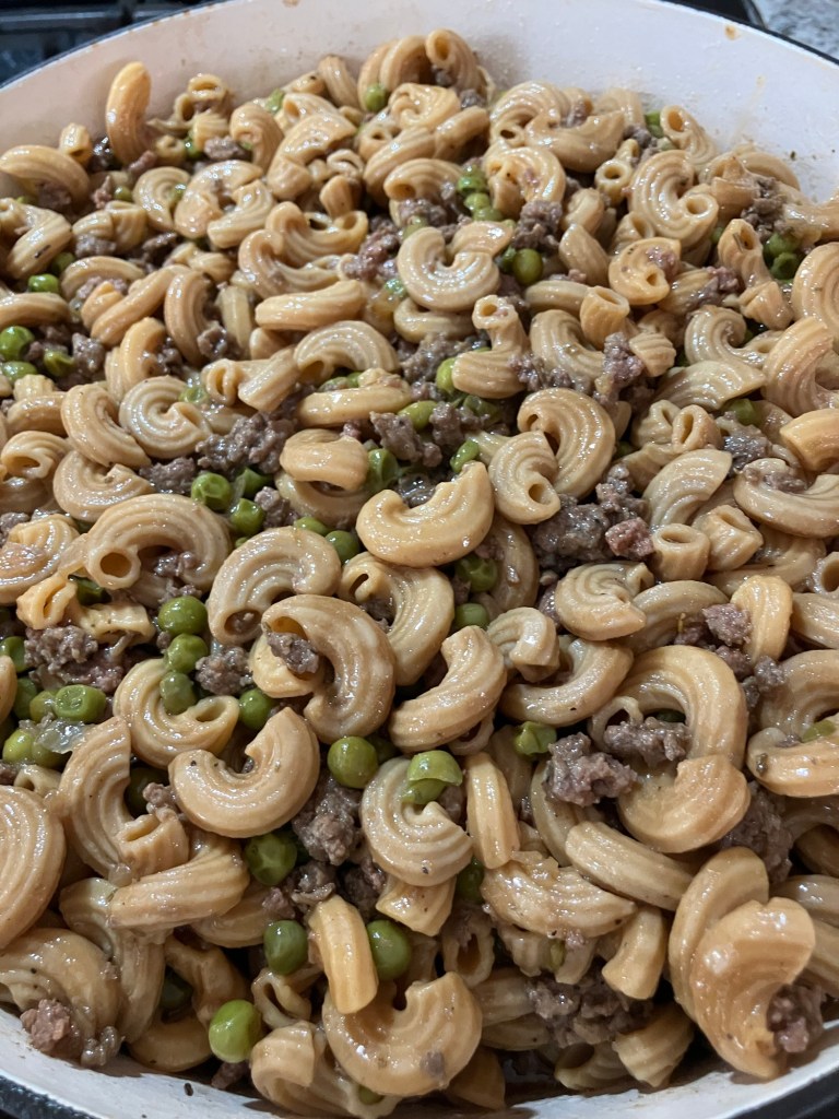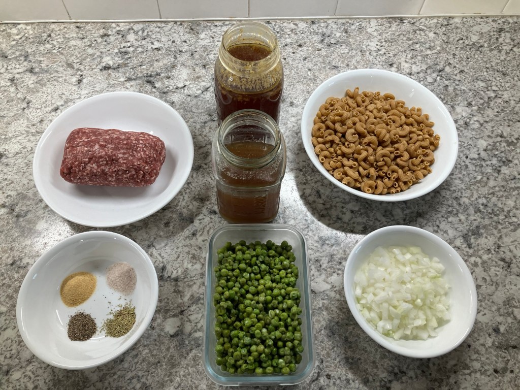 I’ll add noodles, more bone broth, onion, and spices from the pantry to make a brown gravy hamburger skillet with peas.