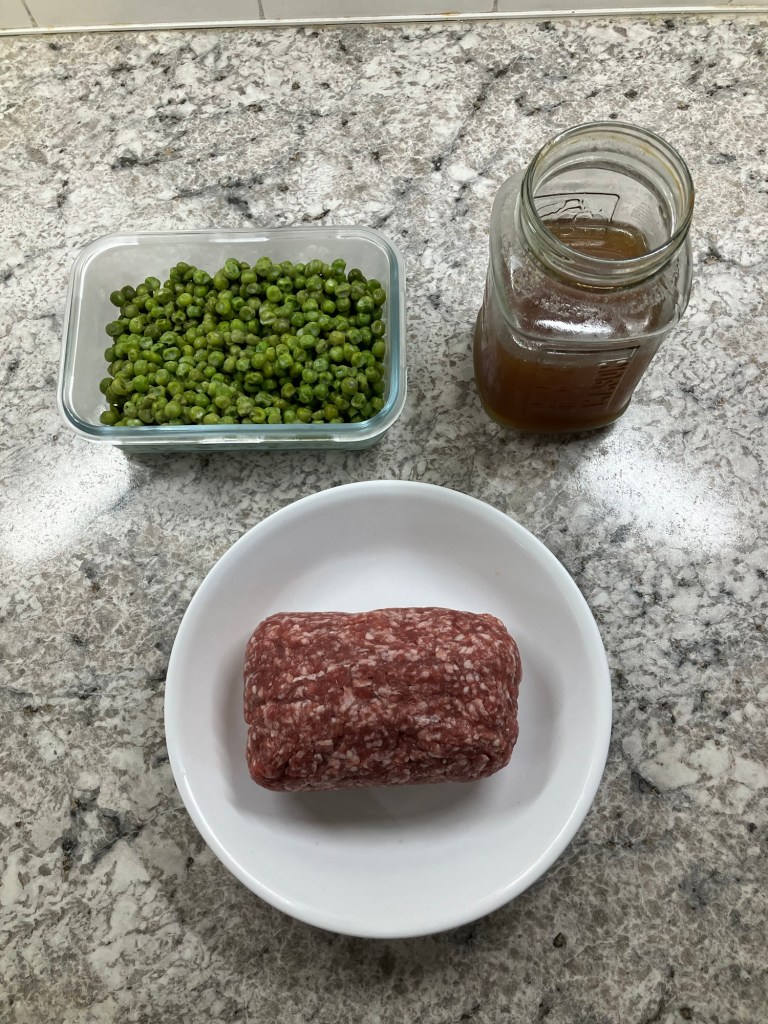 In the refrigerator I have 1 pound of ground beef, a partial jar of bone broth, and leftover peas.