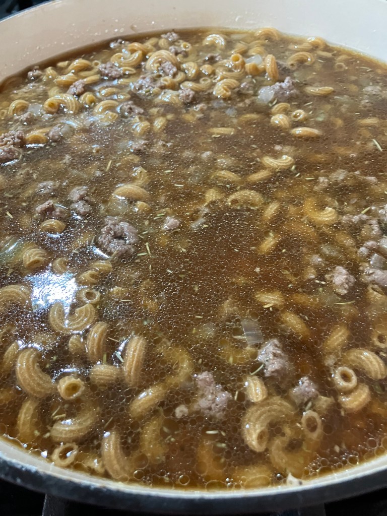 When the ground beef is browned with no pink, I’ll add bone broth and noodles. As the noodles cook I will continue to add bone broth as needed while stirring to ensure that nothing sticks to the pan.