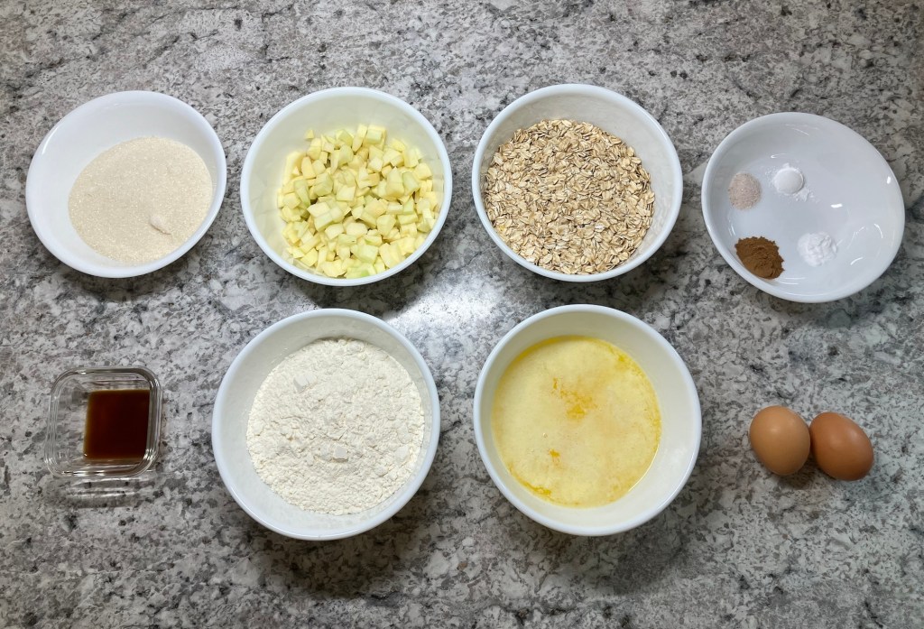 I like to start all baking recipes by setting out all my ingredients and tools. This prevents me from forgetting an ingredient as I go, especially these days as I get interrupted often.