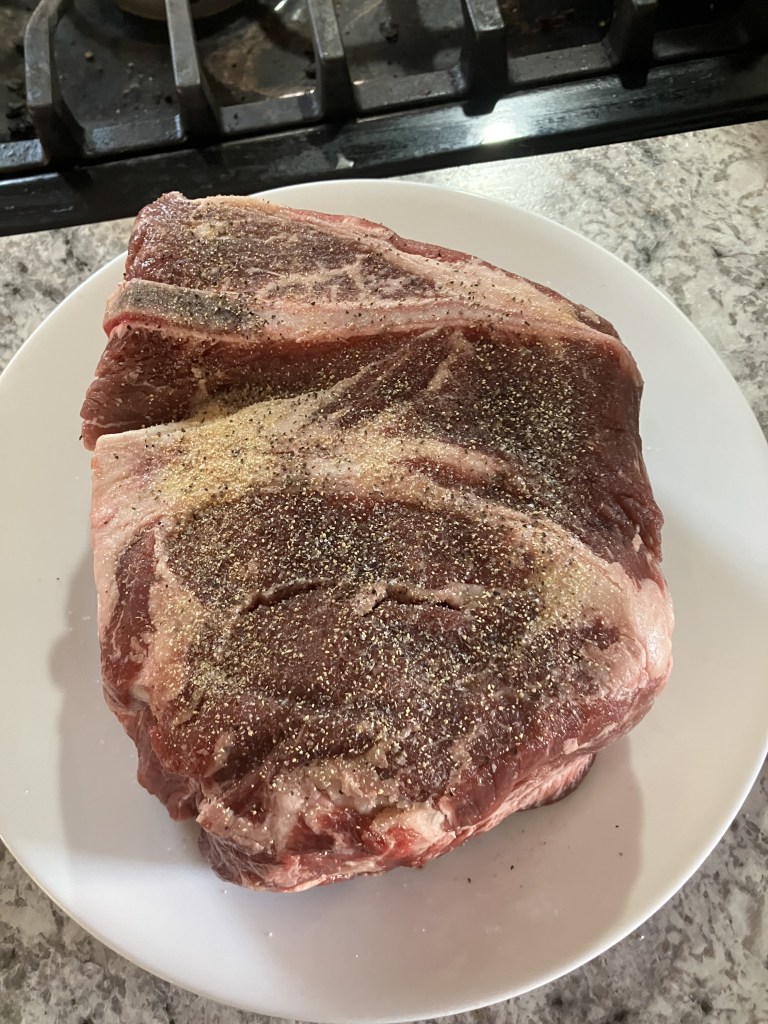 Once you have the roast fully thawed, season at least the two largest surface area sides with salt, pepper, onion powder, and garlic powder.