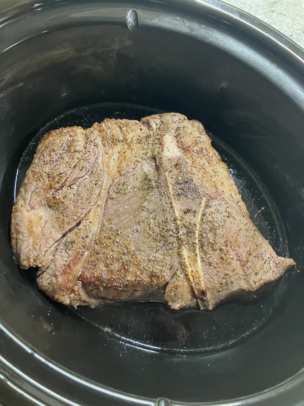 Once the roast has been seared on all sides, transfer it to the slow cooker and add warm water. I like to add enough to just barely cover the roast, but you only need enough to keep it from sticking to the bottom of the slow cooker, about a half inch.
