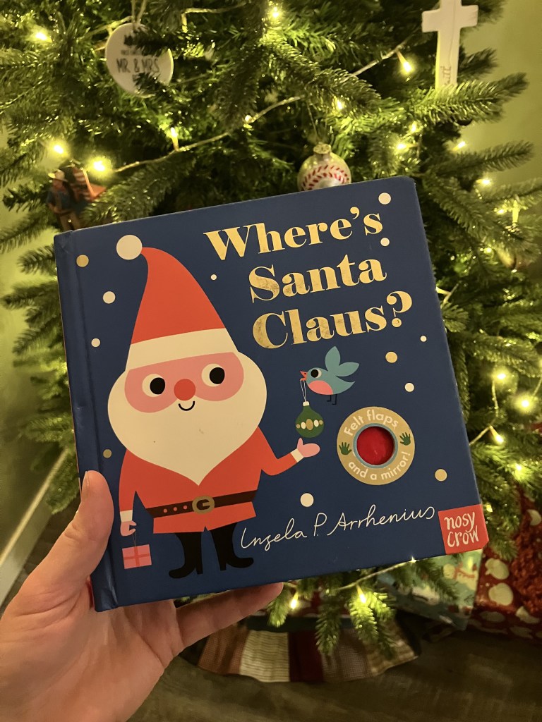 One book that does hold our 9 month old’s attention is “Where’s Santa Claus?” by Ingela P. Arrhenius. It is very short and has felt flaps that she loves to pull down to find the different characters.