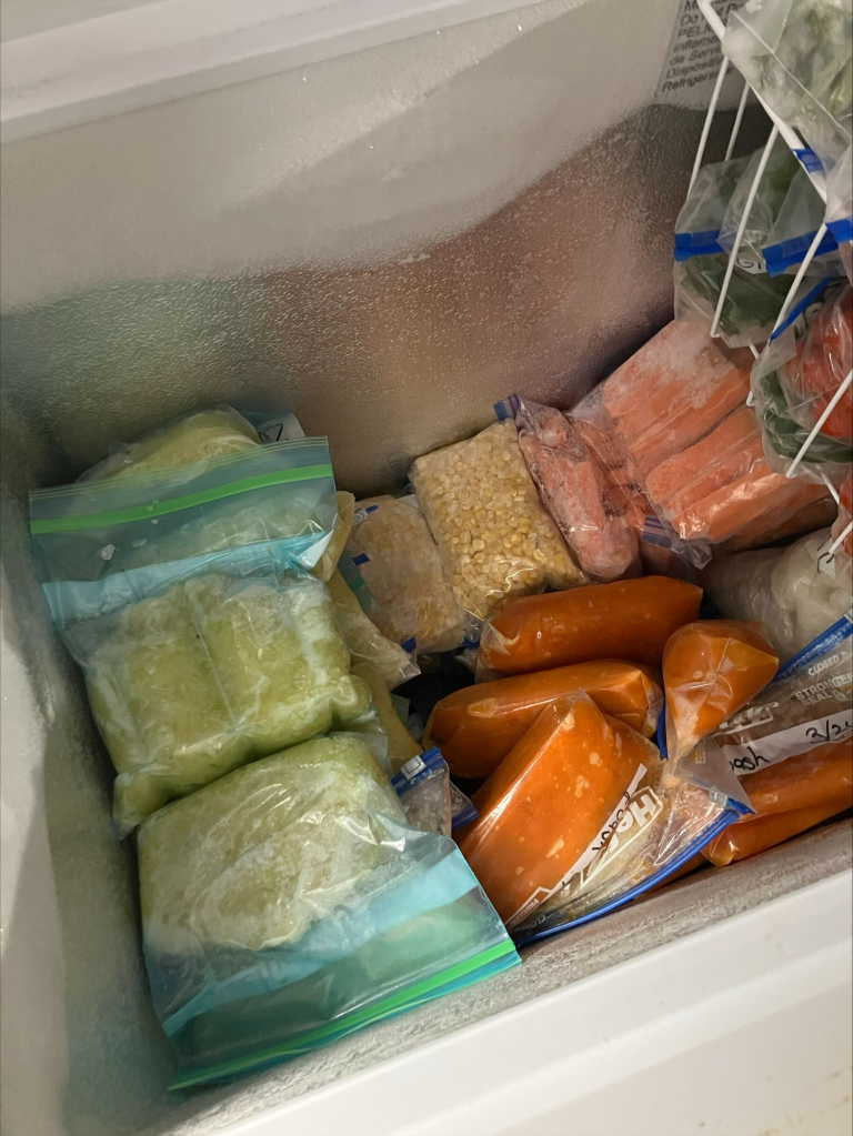 Because we have small chest freezers, each freezer is dedicated to a specific type of meat or food storage. One freezer stores our beef, one stores our pork, another stores additional pork and chicken, and our fourth and final freezer stores vegetables, cheese, butter, and various other odds and ends.