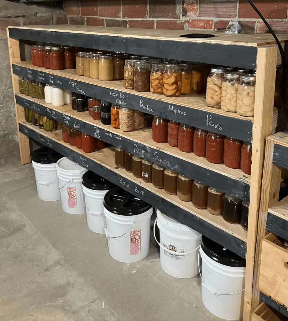 Storing canned goods, especially home-canned canned goods can be challenging. Shelving needs to be heavy enough that it can support the weight while also allowing for a clear view or labeling system so that you can know what you have on the shelves.