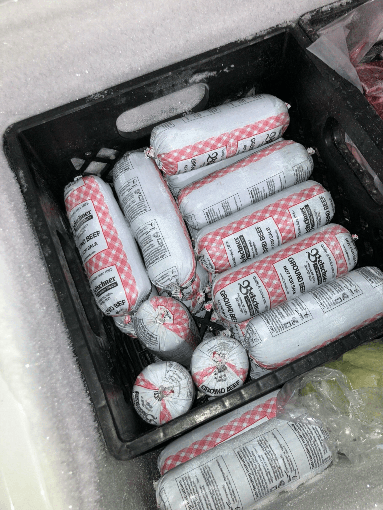 Inside each freezer, we have plastic milkcrates. These work well to separate different cuts of meat. For example, one milk crate stores steaks, another stores ground beef, another stores soup bones and roasts, etc.