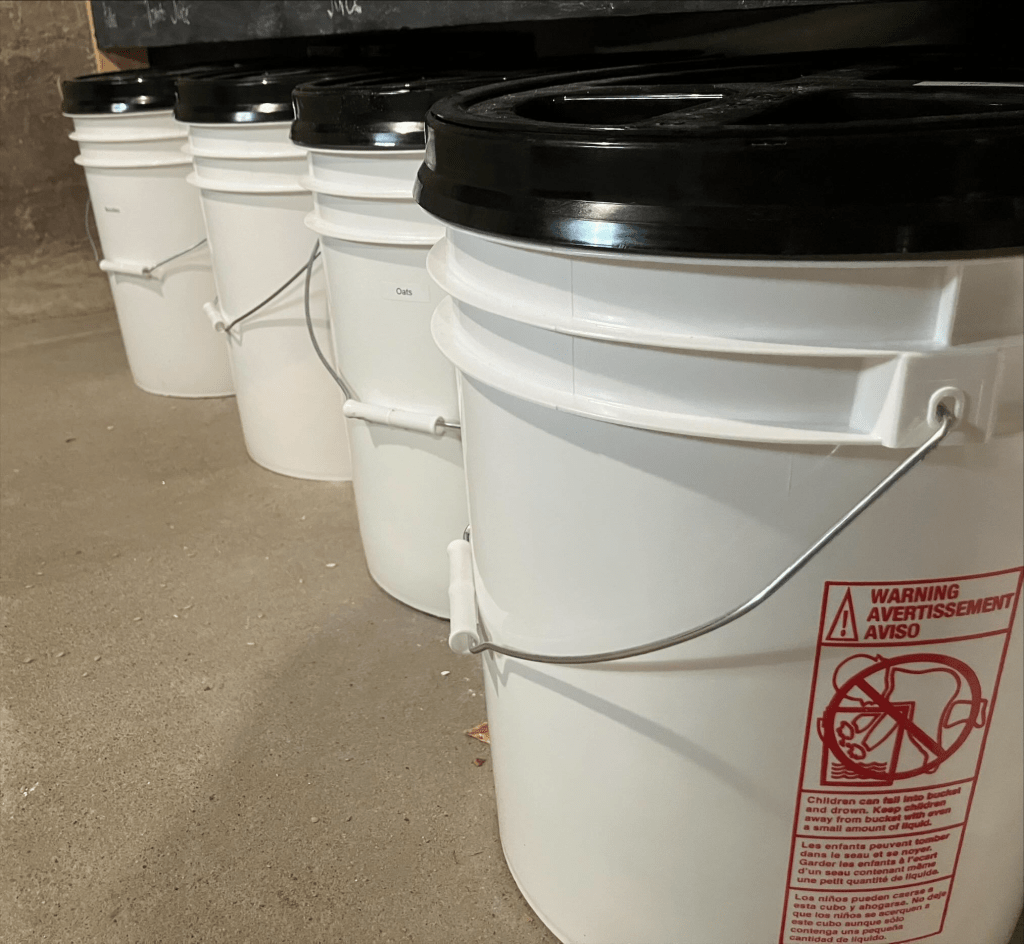 Not only do buckets keep pests and moisture out, but buckets are easily moveable, making them ideal for restocking. (Both your small kitchen containers and the buckets when you get new bulk dry goods!)