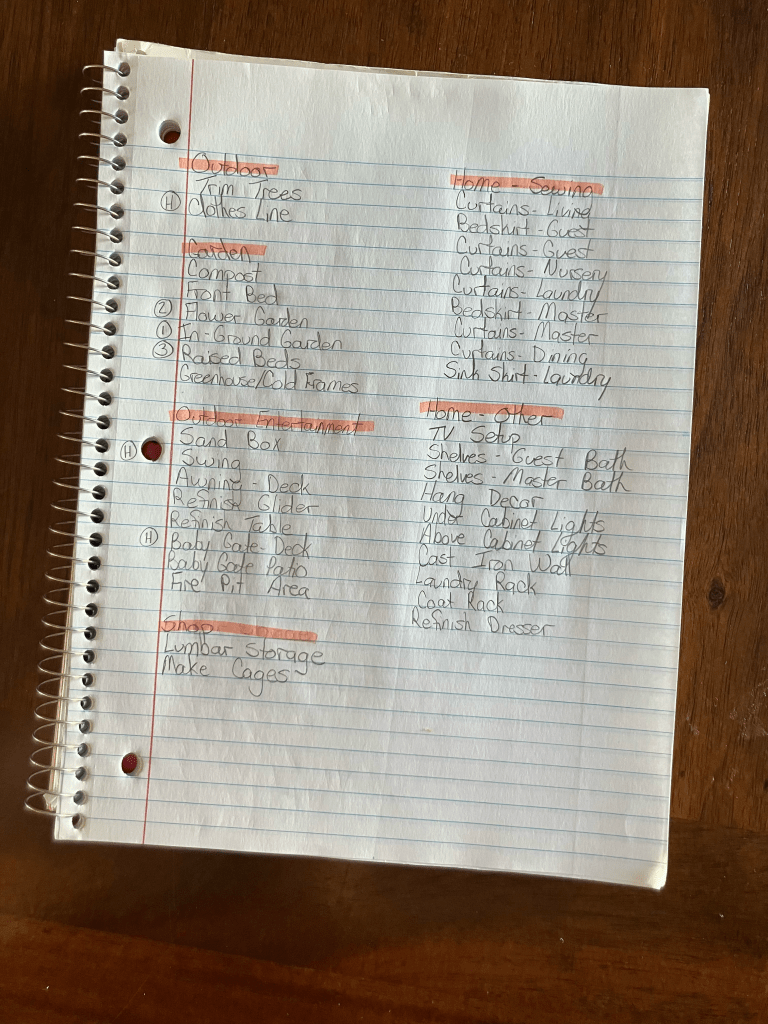 Having a perfectly organized list at this point isn’t necessary, you just want to make it so that you can easily scan through your projects as you make your final to do list. None of our lists have projects in any specific order and very few if any have complete plans as to how they will be finished yet. In fact, some don’t even have a rough plan outside of knowing that we want to add or update that area.