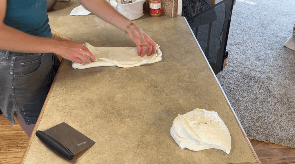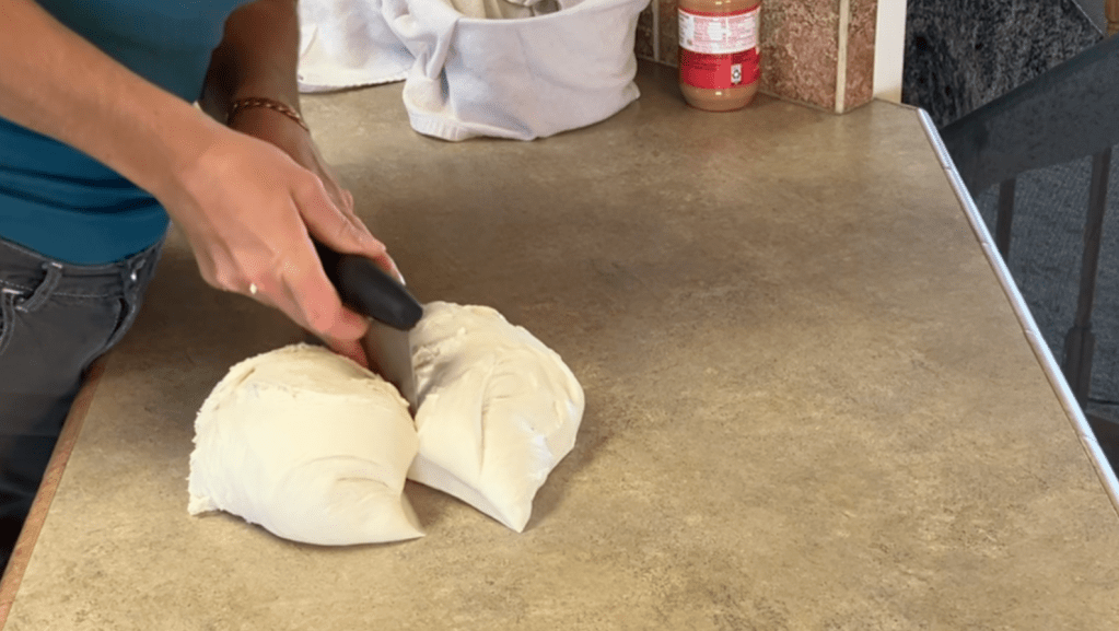 After your dough has completed the bulk ferment, it is time to shape your loaves. Divide the dough into two equal parts using a bench scraper. If you do not have a bench scraper you could use a knife, just be careful not to cut yourself or the counter.