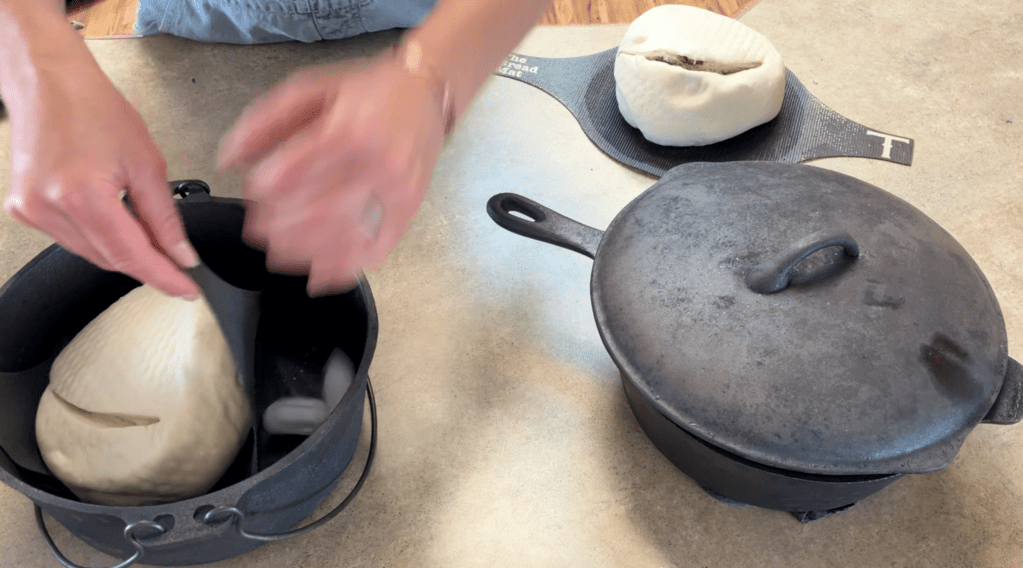 This is when your dough puffs up in the hot oven, thanks to steam and heat. Good oven spring means a tall, airy loaf. To help get a good oven spring, score your loaf deeply and add a couple of ice cubes to each Dutch oven before adding your loaves.