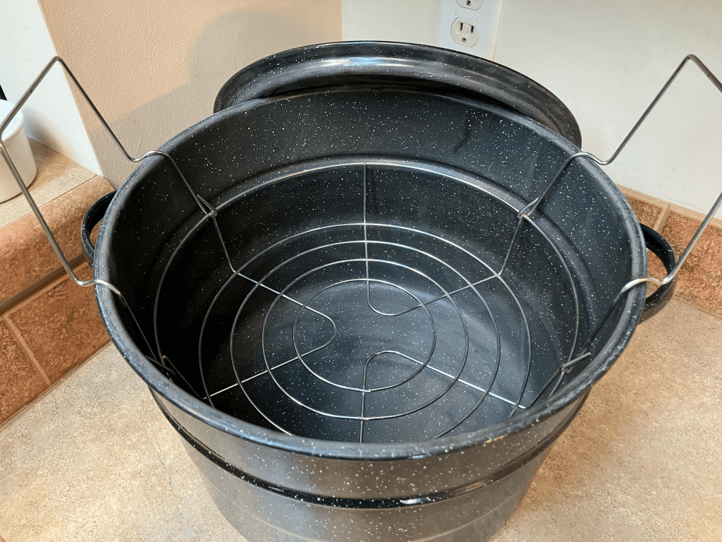 If you do not have a water bath canner but still want to water bath can, you can use a large stockpot, just make sure that the jars can be covered with water.  It is also a good idea to place something in the bottom to keep the jars from directly sitting on the bottom of the stockpot.  I like to place a canning lid upside down if I don’t have a rack that fits the bottom of the pot.