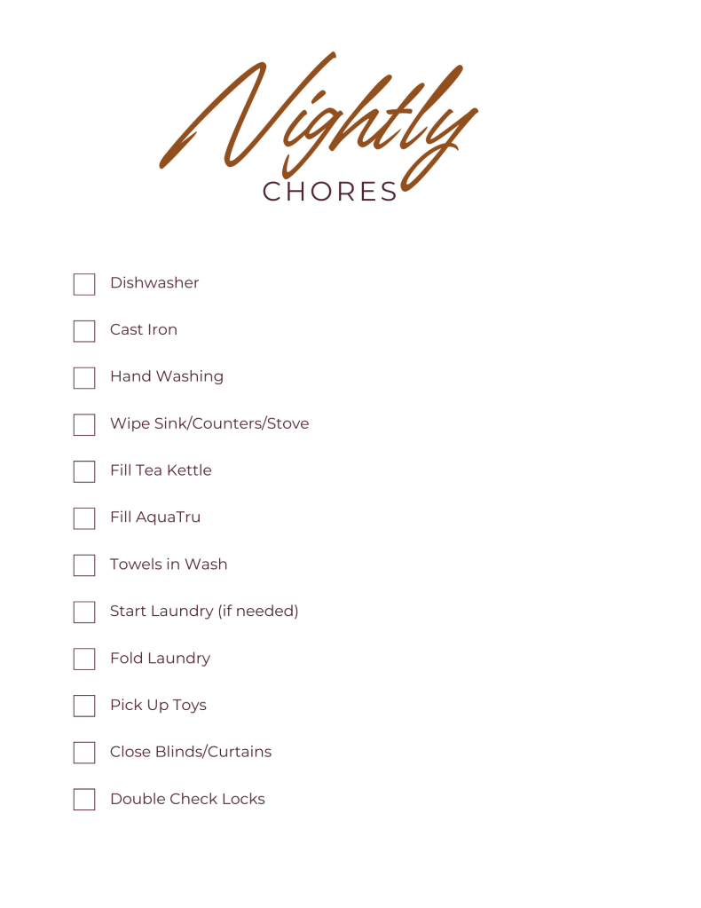 - Involve the Family: Even young kids can help with small tasks like putting toys in a bin or wiping down a table. Turn it into a family routine to lighten your load. I have printed a copy of my nightly checklist, laminated it, and put it on the fridge. When I complete a task, I mark it off with a dry erase marker so that both my husband and I can work on it together.