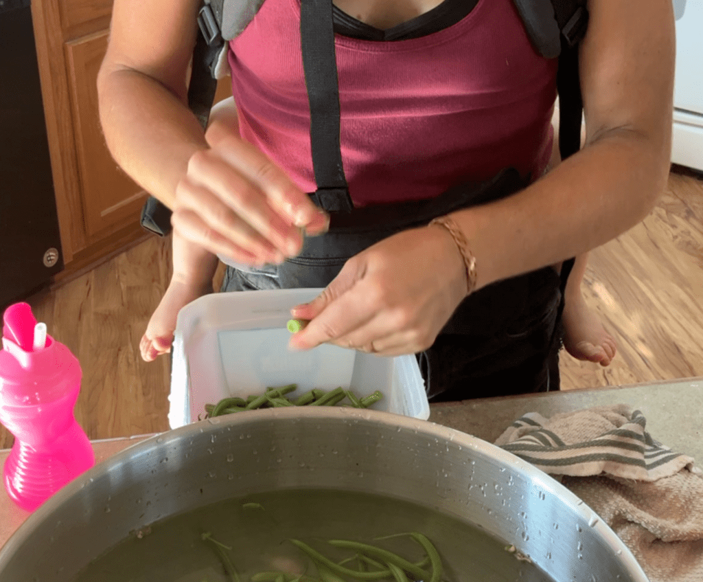 Opt for the freshest beans possible—ideally picked the same day—for the best texture and flavor in your finished product. However, if you are like me and you have a toddler, it isn’t always possible to pick beans and can them the same day. If this is the case, keep the beans as cold as possible without freezing by placing them in water in the fridge or placing a towel over top of the water covered beans in a cooler and covering the towel with ice.