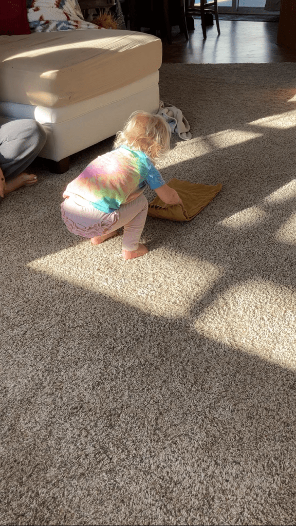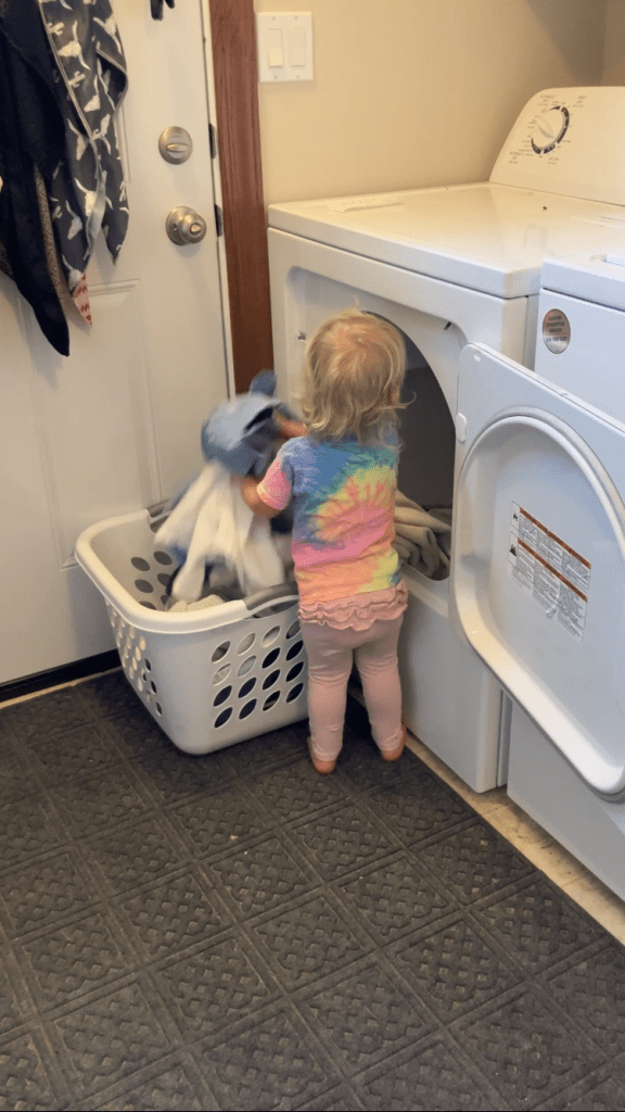 Folding’s the new frontier, introduced around 18 months when her “help” evolved from patting piles to attempting rolls. We start small: washcloths squared (ish) or tees bundled like burritos. Hers aren’t drawer-ready yet—more like enthusiastic wads—but they stack, and that’s victory.