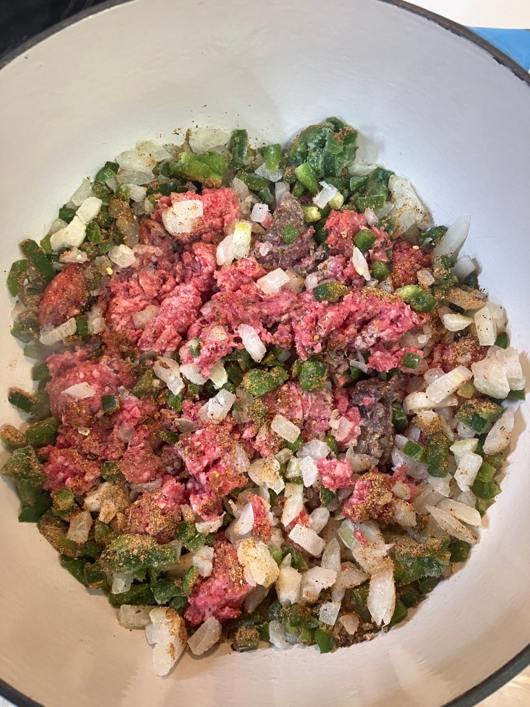 While the rice simmers, heat your stock pot or Dutch oven over medium heat. Add the ground beef (if starting fresh) along with the chopped onion and bell pepper. As it browns, sprinkle in half of your taco seasoning. Stir occasionally until the meat is fully cooked with no pink remaining and the veggies are tender and fragrant.