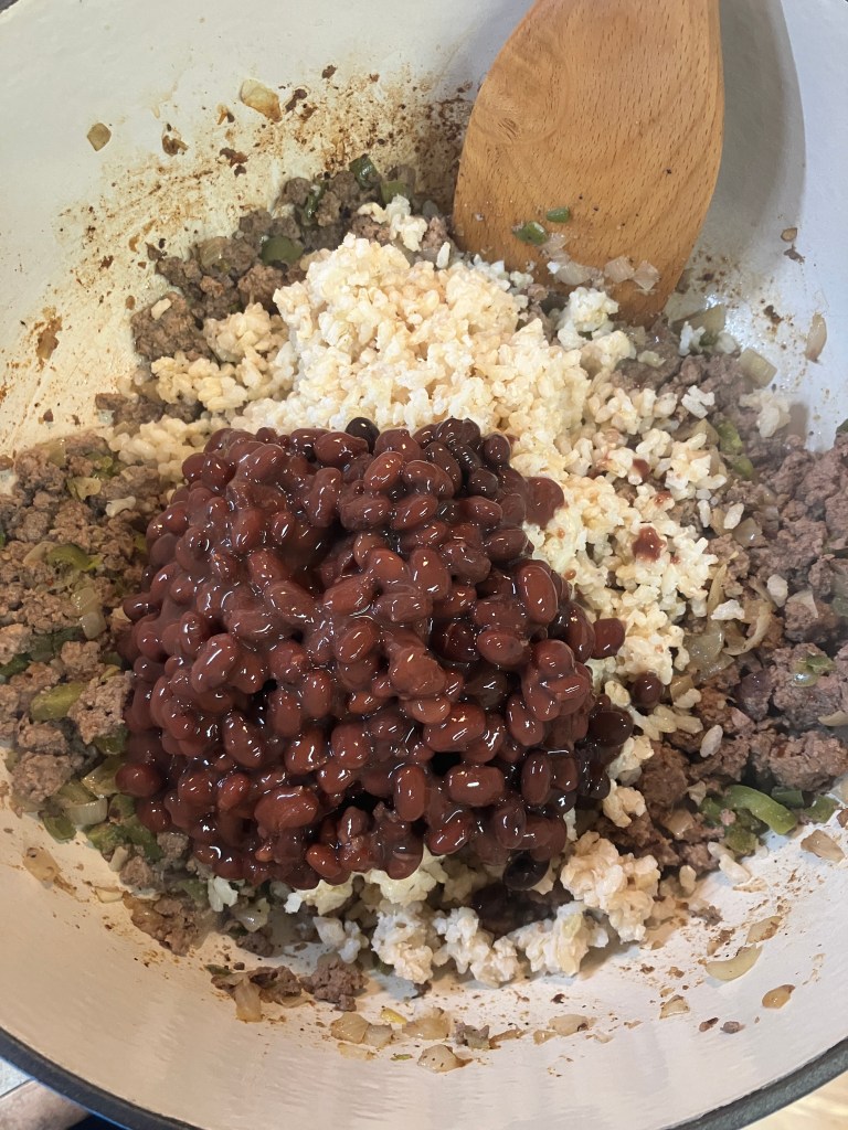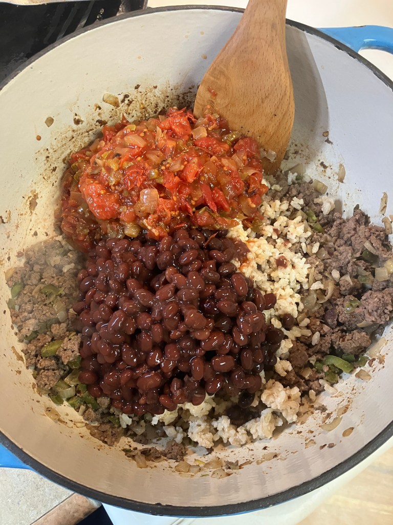 Once the meat is ready, stir in the cooked rice, salsa, drained beans, tomato juice, the remaining half of the taco seasoning, and corn or jalapeños if you’re using them. Give everything a good mix, then bring it to a gentle boil.