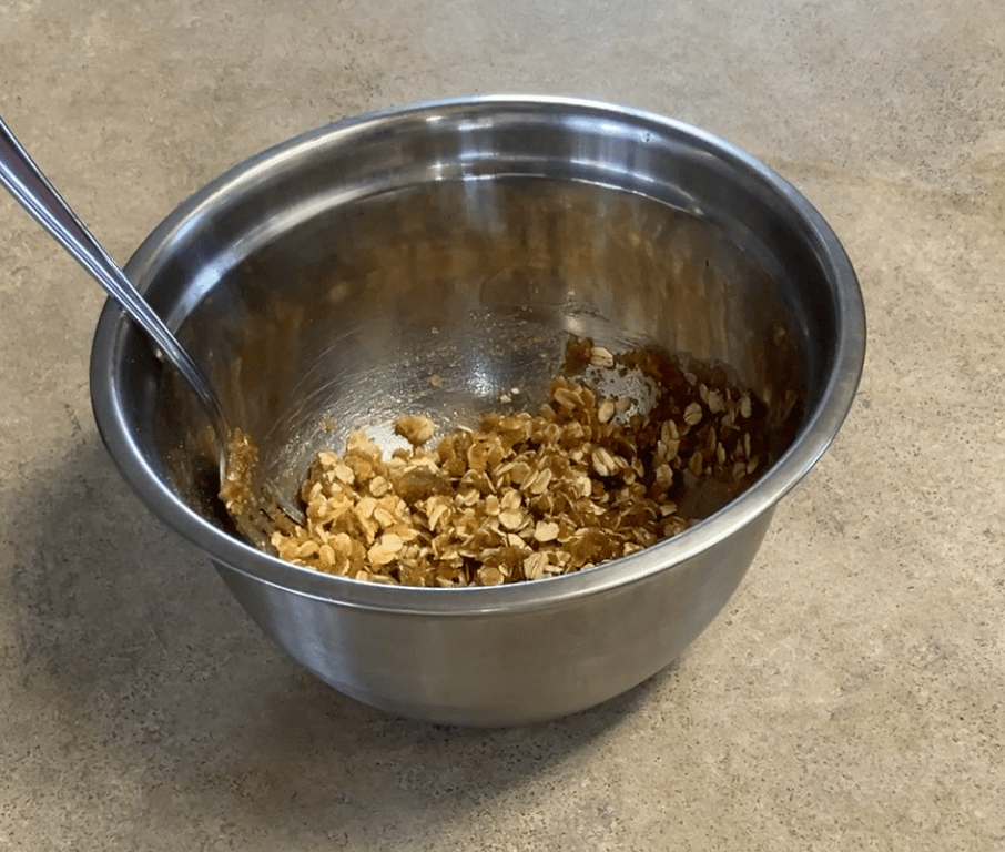 Combine brown sugar, flour, oats, and a bit of melted butter in a small bowl. Use your fingers or a fork to mix until it forms coarse crumbs—like wet sand that holds together when squeezed.